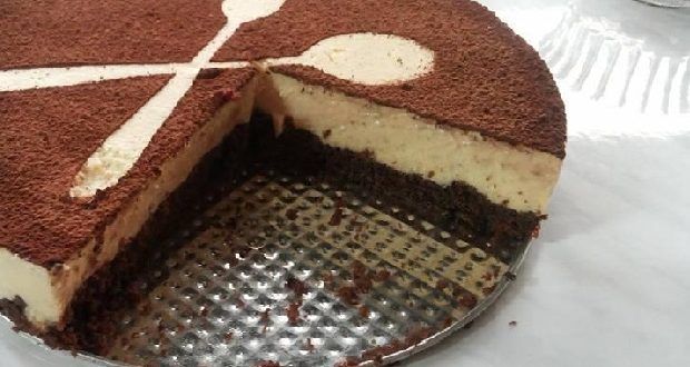 - يصب الخليط السابق فوق قطع كيك الشكولاتة التي تم رصها في البداية، و يوضع في الثلاجة إلى أن تجمد الطبقات تماماً.