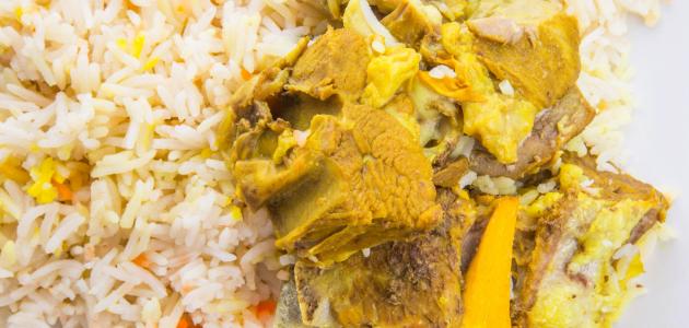 - اضف الارز الى قدر اللحم، ثم اضف الزعفران مع الماء وغط القدر واتركه على نار هادية مدة اربعين دقيقة حتى ينضج الارز تماما.