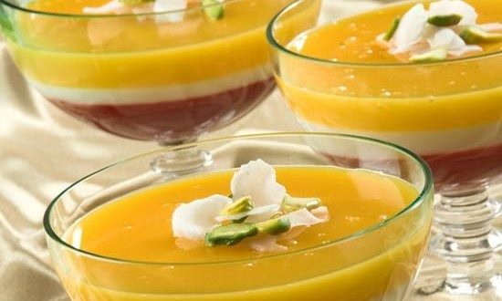 - أحضري أكواب للتقديم و وزعي قطع كيك سويسرول في الأكواب كطبقة أولى ثم أُسكبي مزيج المهلبية البيضاء فوق قطع الكيك ثم وزعي مهلبية قمر الدين فوقها كطبقة أخيرة وزينيها بالفستق الحلبي.