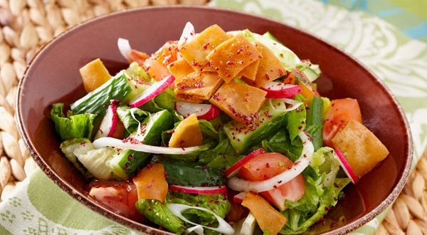 نصف خسة، ضمة بقدونس، 4 حبات بندورة، 4 حبات خيار، قبضة من أوراق النعناع، 5 بصلات خضراء، 5 حبات فجل، حص ثوم مهروس، سماق ناعم وحامض وزيت زيتون (الكمية حسب الرغبة)، خبز محمص أو مقلي بالزيت.