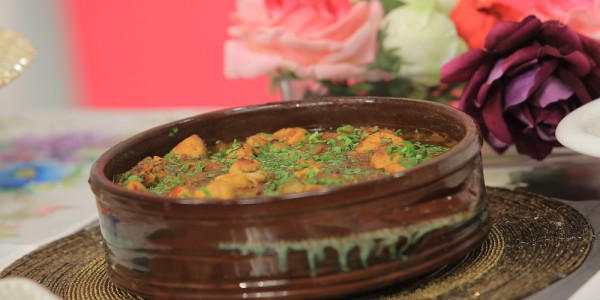 على نار متوسطة، سخني نصف كمية الزيت، ثم أضيفي الدجاج وقلبيه، حتى يُصبح لونه بنيًا، ثم رصي الدجاج في طاجن فخاري.