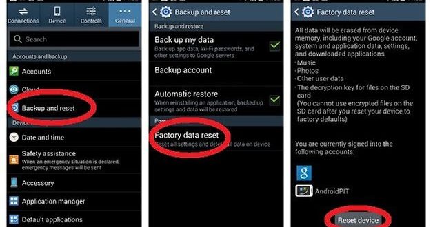 • ثم اضغط على إعادة تعيين بيانات المصنع factory data reset ثم على إعادة تعيين الجهاز reset device