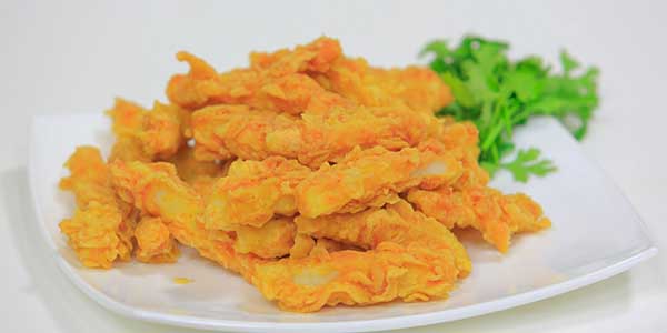 نغمس قطع الدجاج بتتبيلة الدقيق والنشأ والفلفل الحار جيداً حتى تغطيها من جميع الجهات.