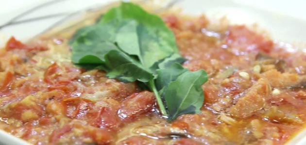 ثم نضع عليه الطماطم حتى تتسبك ورشه فلفل اسود تم الرنجة ونتركها 3 دقائق.