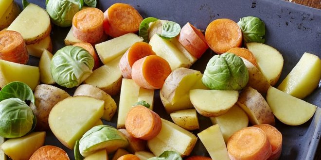 رصي الخضار في صينية فرن مدهونة مسبقاً بزيت نباتي وأضيفي البصل والملفوف وقلبي المقادير.