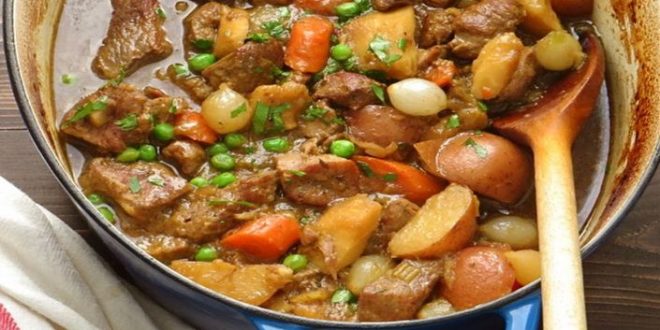 · تبلى مكعبات اللحم بالملح والفلفل الأسود ثم سخنى الزيت فى وعاء كبير على نار متوسطة وضعى اللحم بحيث يأخذ اللون البنى من جميع الجهات ( حوالى 10 دقائق ) ثم ارفعيه جانباً .· ضعى مكان اللحم البصل والثوم مع 2 ملعقة كبيرة من الماء ويطهى مع التقليب بملعقة خشبية حتى يصبح البصل لين ( حوالى 5 دقائق) ثم أضيفي معجون الطماطم وقلبي لعدة دقائق .· أعيدى مكعبات اللحم إلى الوعاء مرة أخرى مع إضافة الطحين وقلبي لمدة لا تقل عن 1 : 2 دقيقة أضيفي كلا من ( المرق – الماء – الروزمارى – ورق الغار – السكر ) وانتظرى حتى يغلى المرق ثم اتركى الوعاء مغطى على نار منخفضة لمدة ساعة و عشرين دقيقة .· أضيفي الجزر والبطاطا ويطهى اليخنة مرة أخرى وهو مغطى لمدة 30 : 40 دقيقة أو حتى ينضج الخضار واللحم مع التحريك من حين إلى آخر .· تخلصى من الروز مارى وورق الغار وأضيفي البازلاء المجمدة ويطهى لعدة دقائق قليلة أو حتى تنضج البازلاء قدمى يخنة اللحم مع الخضار ساخناً مع الأرز الأبيض