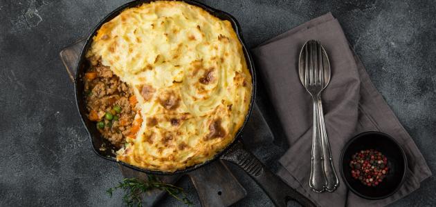 دهن طبق فرن بالزبّدة، وتوزّع طبقة من البطاطس، وفوقها طبقة من اللحم، ثمَّ طبقة أخرى من البطاطس.