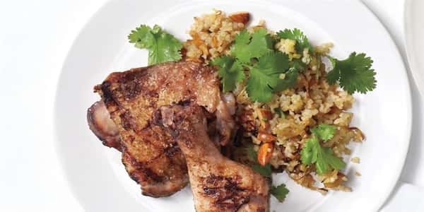 - نسكب البرغل الناضج في طبق التقديم، ومن ثم نضع عليه قطع الدجاج المحمرة، ونزين الوجه بما نرغب حيث ممكن ان نضع شرائح البصل المقلي مع الشعيرية، واللوز المحمص، والصنوبر المحمص.