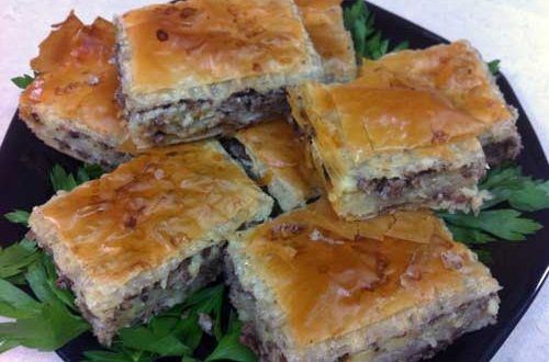 – تحضر صينية مستطيلة متوسطة الحجم ومدهونة بالسمن اوالزبد ويقسم اوراق الجلاش الى جزئين ثم تأخذ كل ورقة وتفرد فى الصينية ثم تدهن بالسمن وهكذا حتى ينتهى الجزء الاول ثم يوضع طبقة اللحمة المفرومة وتفرد جيدا وبعدها تفرد اوراق الجزء الثانى من الجلاش وتدهن بالسمن اوالزبد الى ان تنتهى .