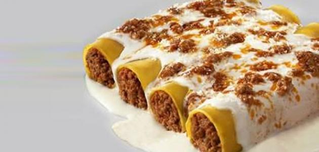 • افرد احدى شرايح المعكرونة على طبق، ثم ضع عليها بعضا من الحشوة، ولفها حتى تصير انبوبية الشكل، وتاكد من ان تكون حافتها الى اسفل، وكرر تلك الخطوة لجميع الشرايح الاخرى.