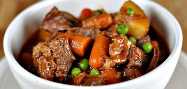 - تغطية القدر وترك الخليط يطهى على نار هادية لفترة ساعة تقريبا، او الى ان تصبح مكعبات اللحم طرية.