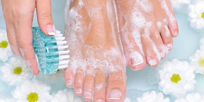بعد استعمال المقشر على القدمين، ينصح بفركها جيدا باستعمال الفرشاة.