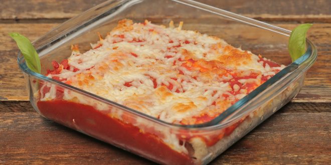 7- أعيدي الكرة حتى انتهاء الكمية، وزعي الصلصة على الوجه ثم ادخلي الصينية الى فرن محمى مسبقاً على حرارة 180 درجة مئوية لحوالى 25 دقيقة.