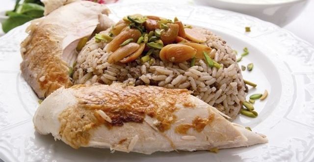 4. يخلط الأرز مع ملعقة صغيرة من خليط البهارات ويوزع فوق قطع الدجاج.